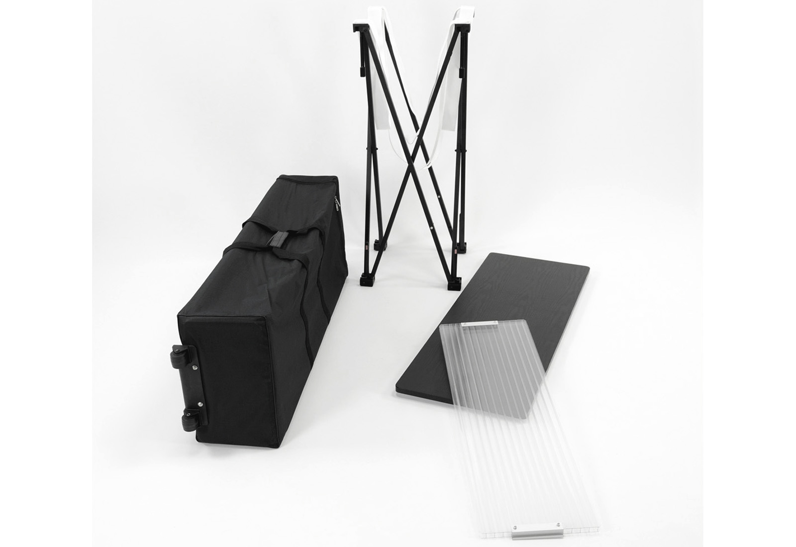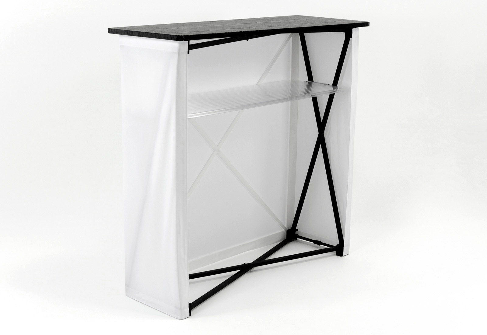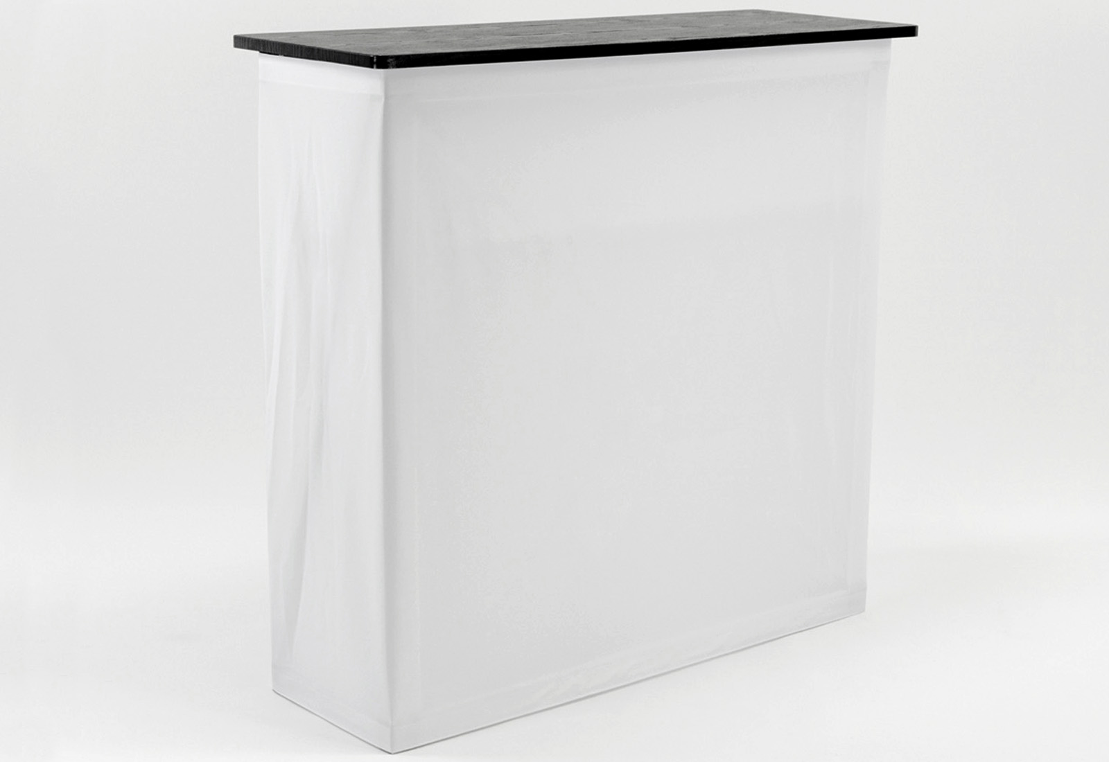Die Theke Fabric ergänzt ideal bekannte Fabric- oder Textilwände wie die Easy Fabric Messewand. Durch den umlaufenden Digitaldruck entsteht eine maßgeschneiderte Werbefläche. Die textile Grafikbespannung wird mühelos am Klettrahmen der Thekenkonstruktion mit Flauschband befestigt, wodurch das System kostengünstig für unterschiedliche Anlässe angepasst werden kann. Die Theke lässt sich leicht und platzsparend zusammenfalten und ist somit unkompliziert zu transportieren. Ausgestattet mit einem Einlegeboden bietet die Fabric Theke praktischen Stauraum. Der Transport erfolgt bequem in einem schwarzen Trolley.