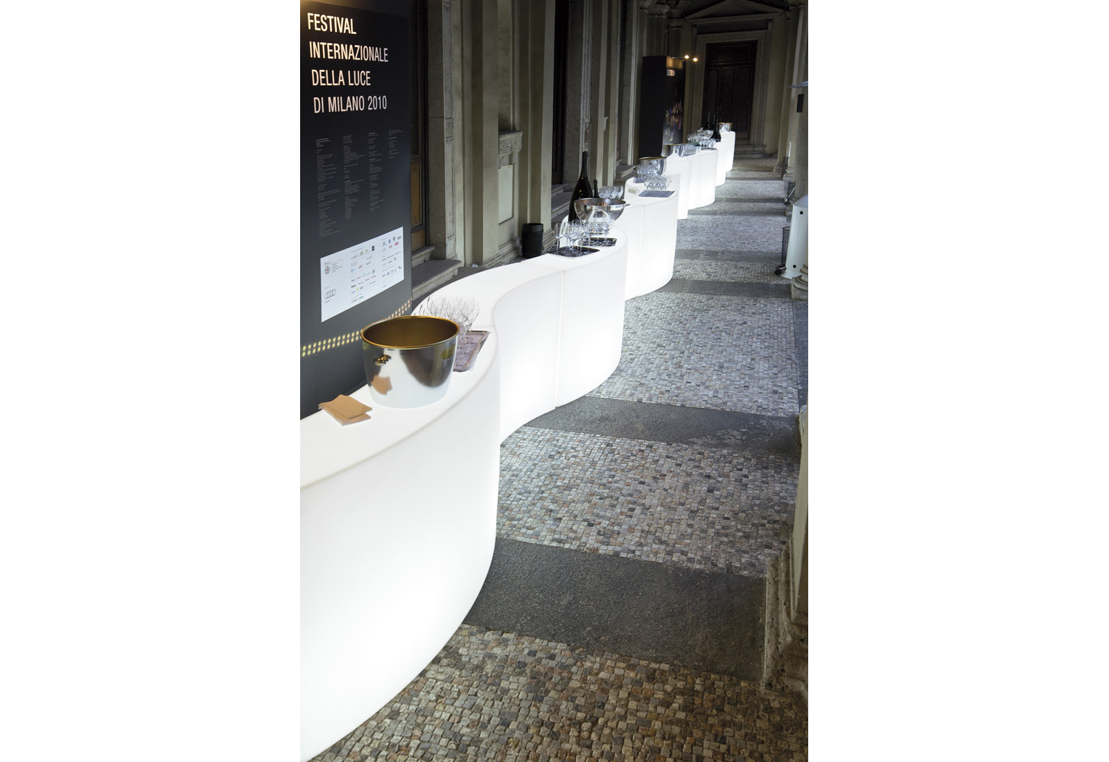 Die beleuchtete SNACK Theke ist eine Leuchttheke, die jeder Veranstaltung das gewisse Etwas verleiht. Betrieben mit 2 Energiesparlampen mit max. 25 Watt leuchtet die SNACK Theke hell genug, um den Kunden zu zeigen, wo der Mittelpunkt der Messe oder der Veranstaltung ist. Die aus robustem Polyethylen gefertigte SNACK Theke hat eine angenehme Höhe von 100 cm und wiegt nur 20 kg. Zur Veredelung bieten wir für die SNACK Theke auch eine gebogene Glas- oder Stahlplatte an. Diese empfiehlt sich fast grundsätzlich, da Gläser und Flaschen auf dem Glas bzw. Stahl sicherer stehen. Auf Wunsch kann die SNACK Theke auch mit einem Logo versehen werden.