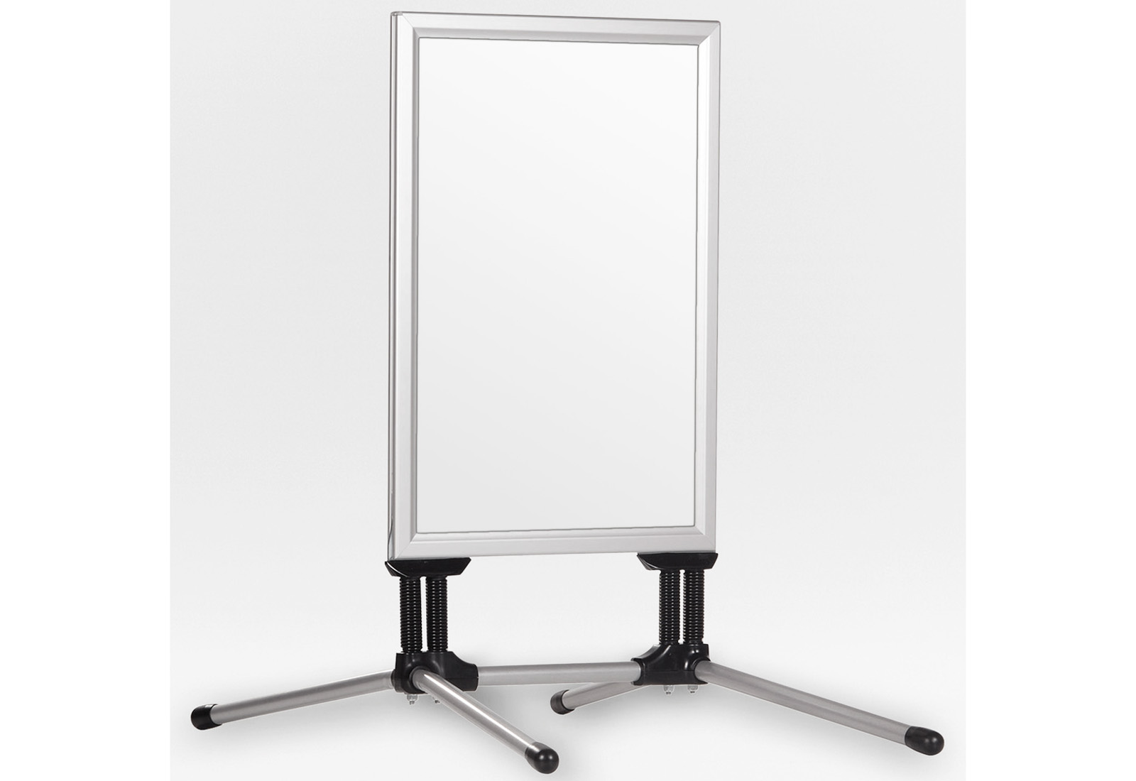 Kundenstopper sind aktive Verkaufshelfer, die niemand übersieht. Der hier vorgestellte, doppelseitige Kundenstopper Swing ist in unterschiedlichen Formaten lieferbar - für Plakate in den Formaten DIN A1 und DIN A0. Diese sind durch Antireflexfolie geschützt. Der Kundenstopper ist durch umlaufende Dichtungen wetterbeständig und hält selbst stärkerem Wind stand. Der weit ausragende Standfuß wird in Einzelteilen geliefert. Diese bestehen aus 5 Stahlrohren, die mit Kunststoffverbindern aneinander gefügt werden. An der Unterseite des Aluminium-Klapprahmens befinden sich 4 bewegliche Federn, die ein Umkippen des Kundenstoppers zusätzlich verhindern.