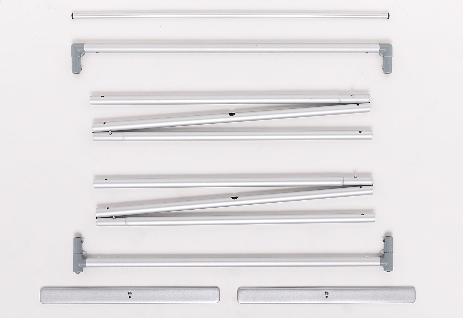 Der Aufbau ist auch von ungeübten Personen leicht durchführbar: Durch einen einfachen Klick-Mechanismus lassen sich die Einzelteile schnell verbinden. Der bedruckte Stoffbezug wird anschließend mühelos über den Rahmen gestülpt und an der Unterseite mit einem Reißverschluss gespannt, wodurch eine glatte und faltenfreie Präsentationsfläche entsteht. Der Bezug selbst besteht aus hochwertigem Stretchmaterial, das bei 30 Grad waschbar ist, was die Pflege und Wiederverwendbarkeit besonders komfortabel macht.