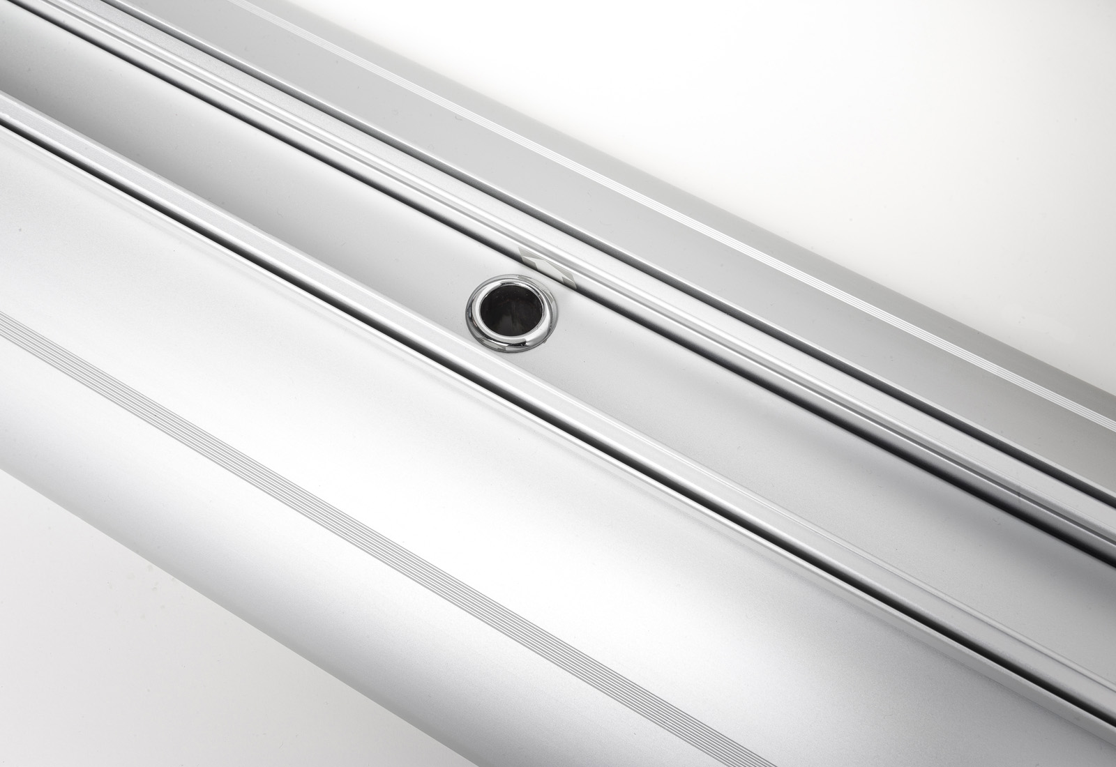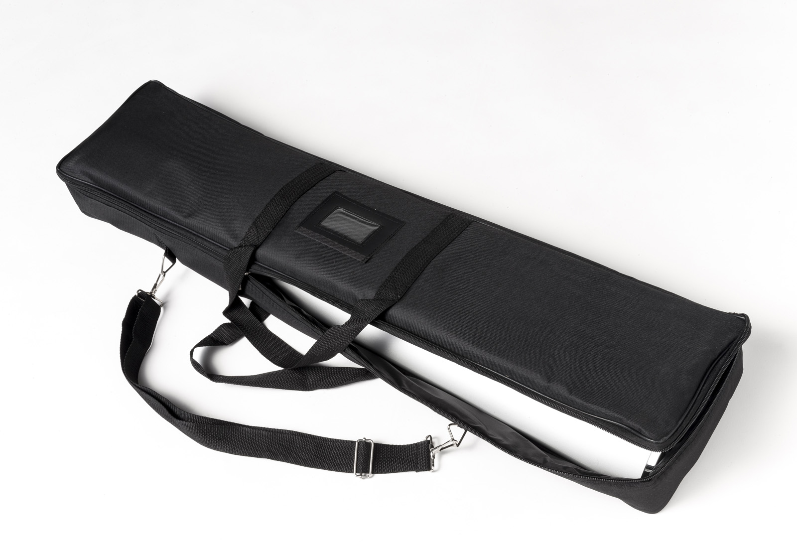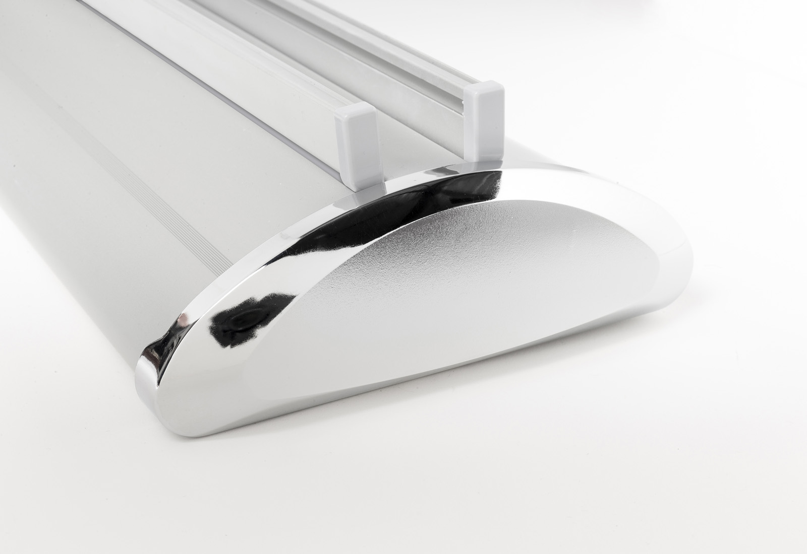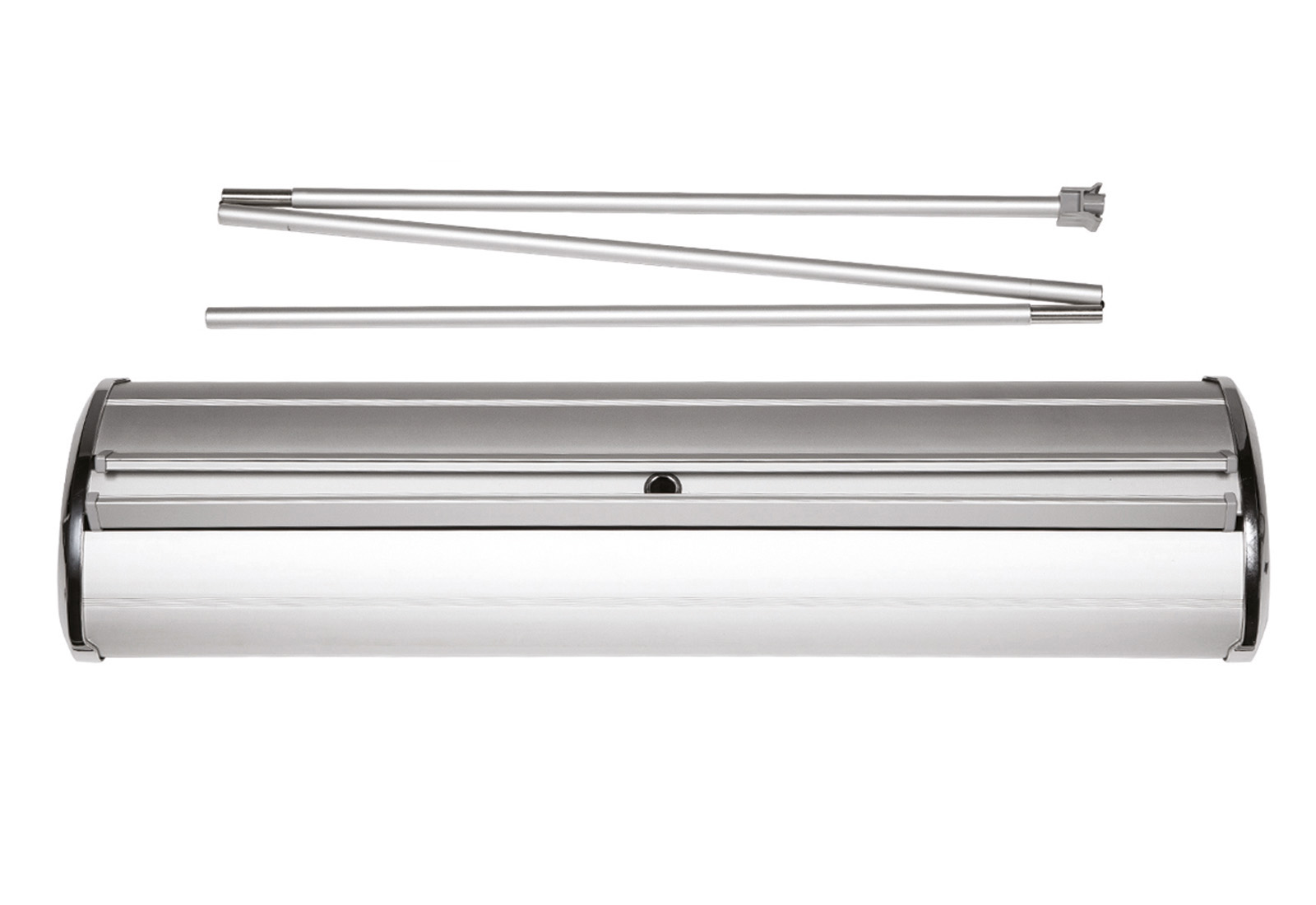 Bei dem RollUp Double handelt es sich um ein System, bei dem sich zwei Grafikbanner in einer Aluminium-Kassette befinden. Die Drucke stehen gegeneinander, sodass das RollUp eine Vorder- und Rückseite bildet. Der Bannerabstand ist minimal zueinander. Die Seitenkappen der Kassette sind verchromt. Hier gibt es auch ein praktisches Fach zum Archivieren der mittigen Haltestange. Das System besitzt an der Unterseite kleine, drehbare Stellfüße, wodurch das System völlig gerade gestellt werden kann. Neben der ausgezeichneten Qualität und dem elegantem, formschönen Oberprofil überzeugt der günstige Preis. Standardgemäß wird das System mit einer schwarzen Transporttasche ausgestattet. Bei Bedarf können die Grafikdrucke natürlich durch neue, aktuellere Drucke ersetzt werden. So kann ein und dasselbe System über viele Jahre hinweg eingesetzt werden.