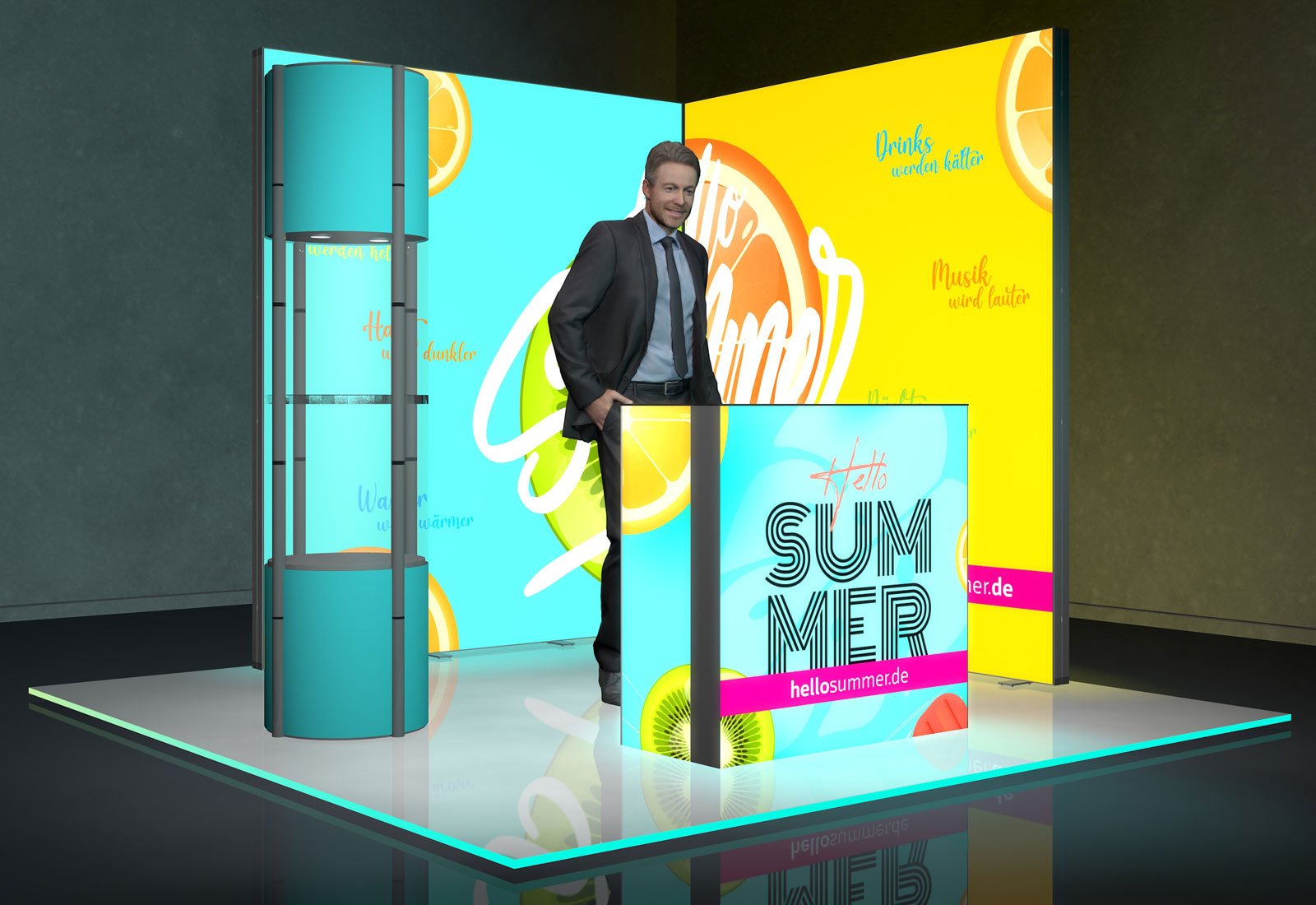 Dieser LED-Messestand ist konzipiert für 3 x 3 m Standflächen. Das ALU LightUp Leuchtwandsystem ist perfekt für Selbstaufbauer geeignet.